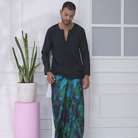 Introducing our Abstract Aqua Pajamalungi where timeless black meets statement art prints for a bold, cultural aesthetic. Model is 6 feet tall, wearing Size L.