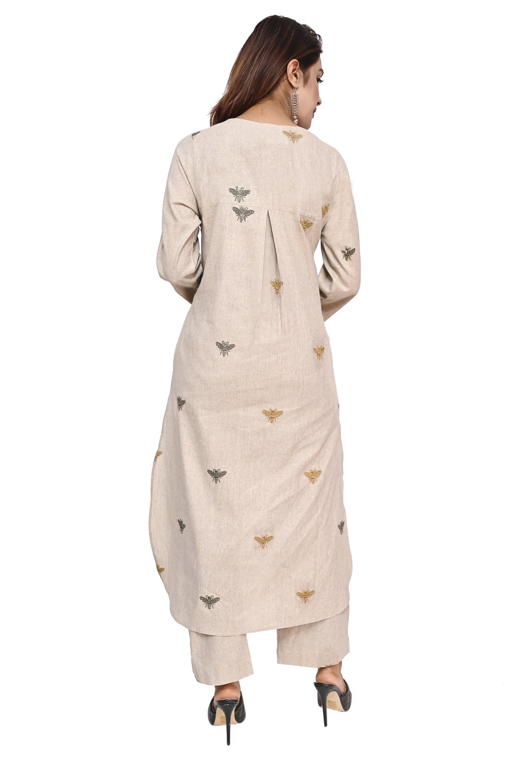 Beige Honey Bee Embroidered Kurta Palazzo Set