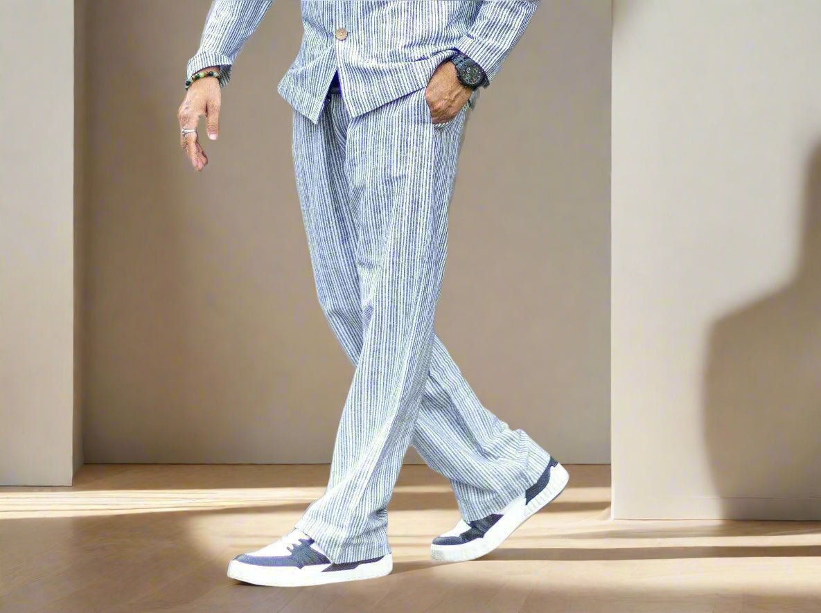 The pajama complements the blazer with its matching striped cotton fabric. Its loose-fit design prioritizes comfort while retaining a modern aesthetic. Perfect for casual strolls or lounging, the pajama's breathable material allows ease of movement and ensures you stay comfortable throughout the day. The elasticated waistband adds convenience and a secure fit, making it an excellent choice for both relaxation and style.