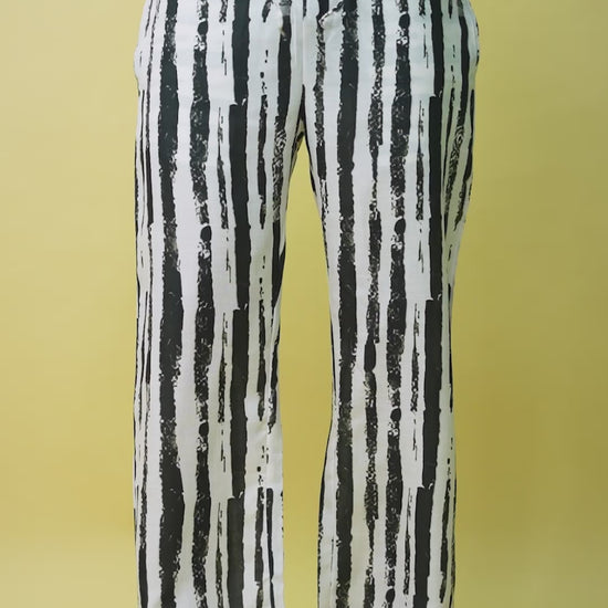 Make a bold statement with this Black & White Brush Stripe Pajama. Featuring an artistic hand-brushed vertical stripe design, this pajama brings together comfort and a modern edge. Crafted from breathable cotton blend fabric with a relaxed straight fit, it’s perfect for lounging or casual wear.