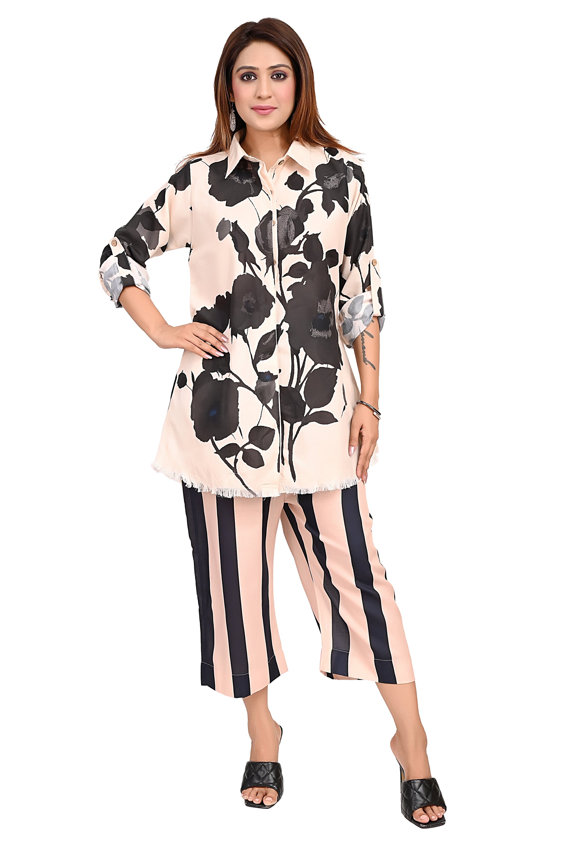 This stylish co-ord set is a perfect blend of elegance and modern fashion. The floral printed shirt-style kurta paired with striped straight-fit pants creates a chic and contemporary look. Crafted from lightweight and breathable fabric, it ensures all-day comfort, making it ideal for both casual and office wear.