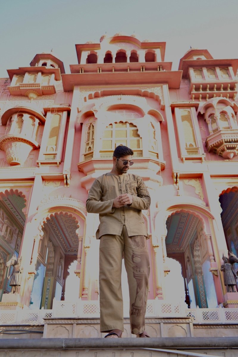 The pants match the kurta in brown tone, creating a cohesive look.Like the kurta, the fabric seems to be breathable and lightweight cotton , ideal for comfort and movement.