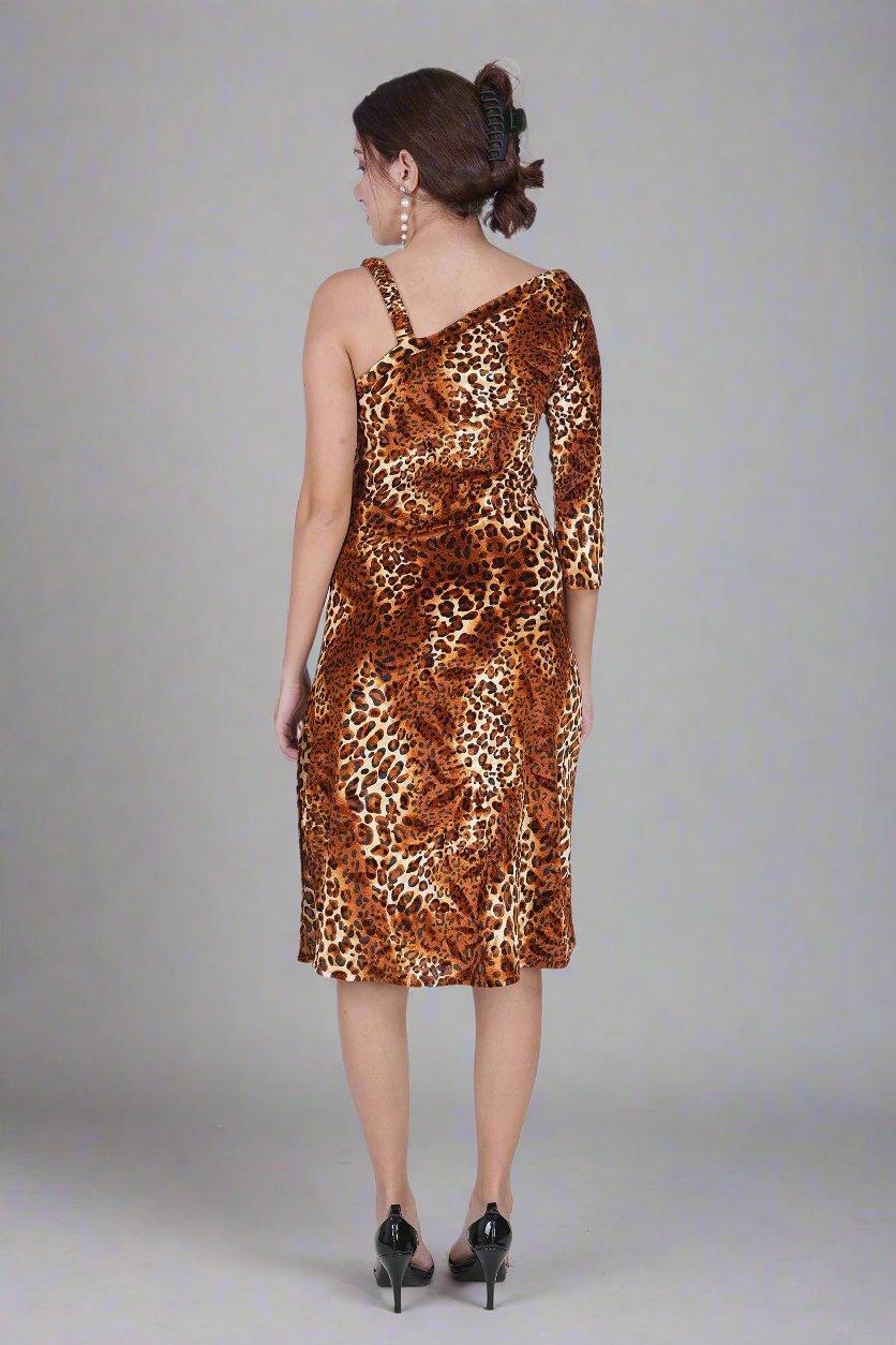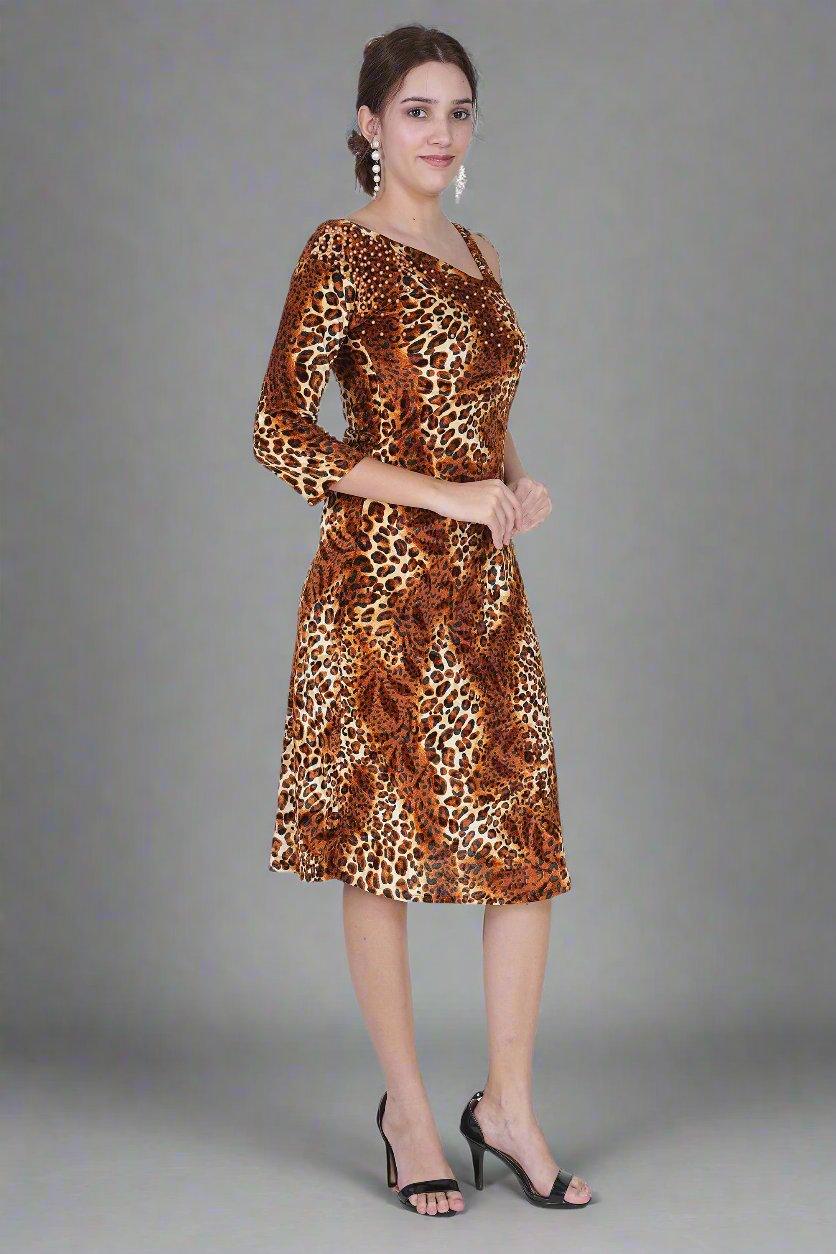 Add some wild style to your wardrobe with our brown Velvet Leopard Print Dress with Pearls! Its soft velvet fabric and playful leopard print will make you stand out from the crowd. With a unique one shoulder strap and eye-catching pearl accents, this dress is perfect for any occasion. Measuring at 40 inches in length, it's a must-have for any fashion-forward individual. Don't miss out on this fierce fashion statement!