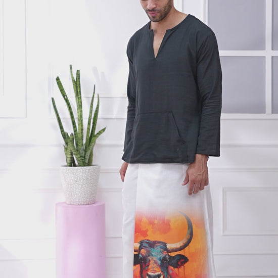 Introducing our Bull Art Pajamalungi where timeless black meets statement art prints for a bold, cultural aesthetic. Model is 6 feet tall, wearing Size L.