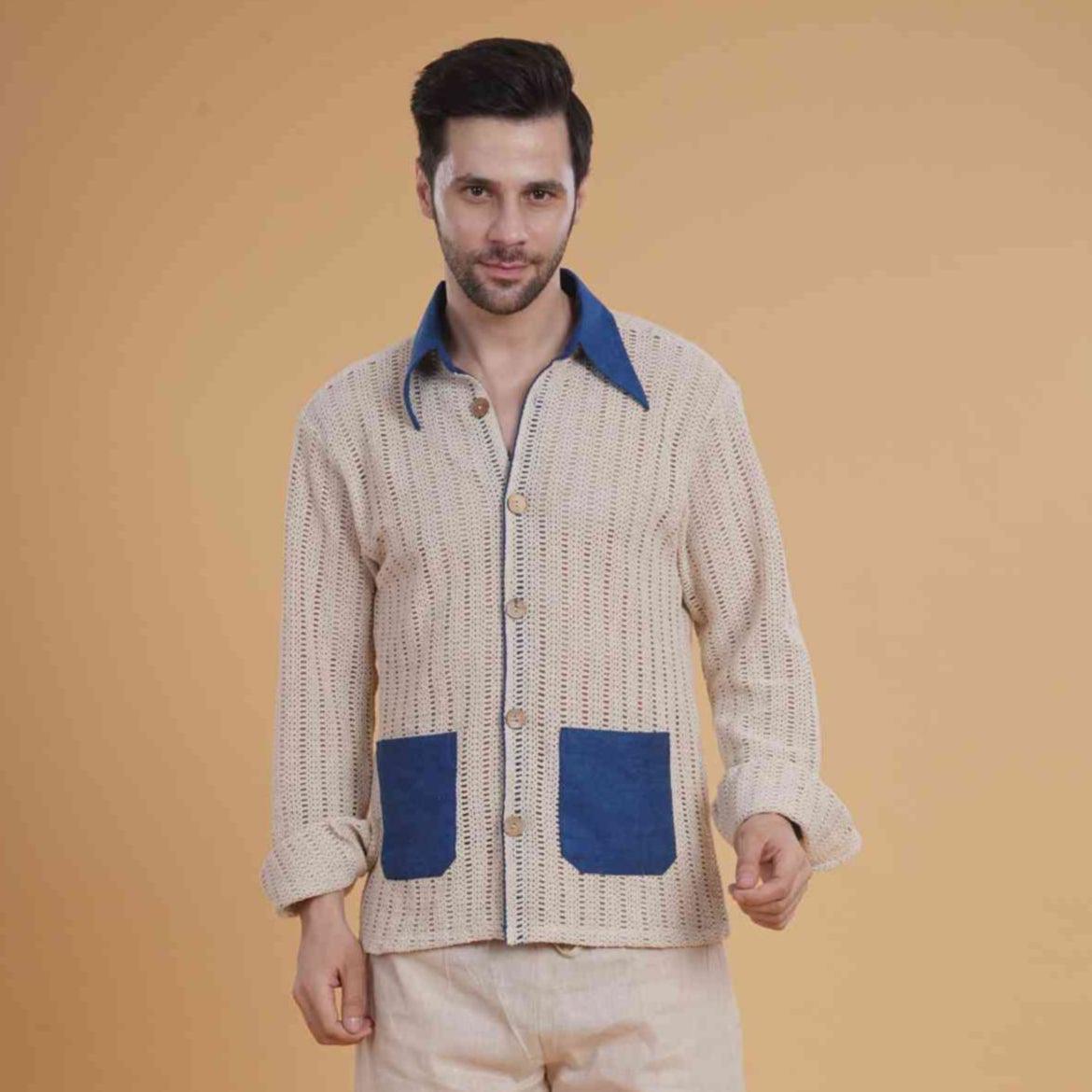 Design: Full-sleeve cotton crochet shirt with front buttoned placket, featuring contrast blue collar and outer and inner side patch pockets for a contemporary twist.