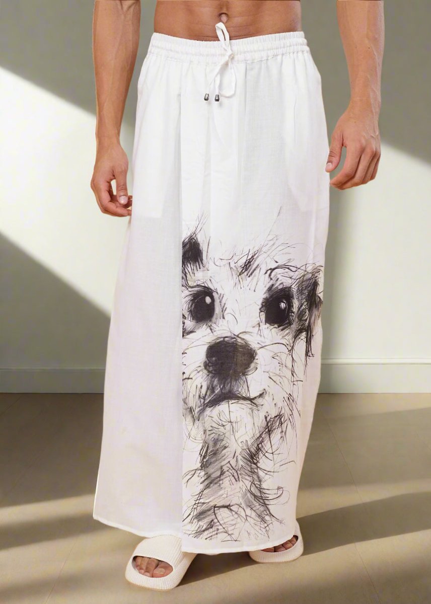 Introducing our Doggo Doodle Pajamalungi a vibrant combination of tropical charm and modern tailoring, ideal for vacations and festive gatherings. Model is 6 feet tall, wearing Size L.