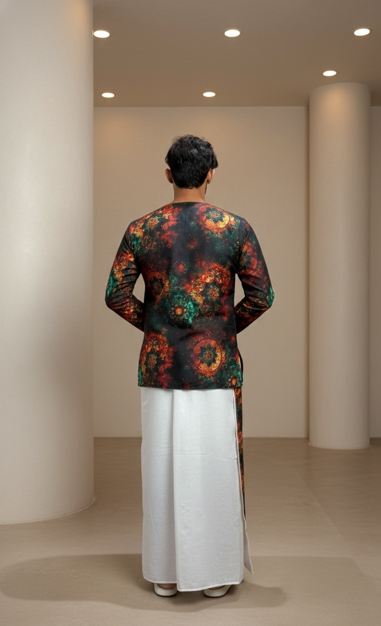 The Serene Lotus Ensemble Pajamalungi seems like a regular lungi, but that design makes the look absolutely stunning.