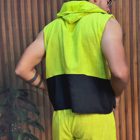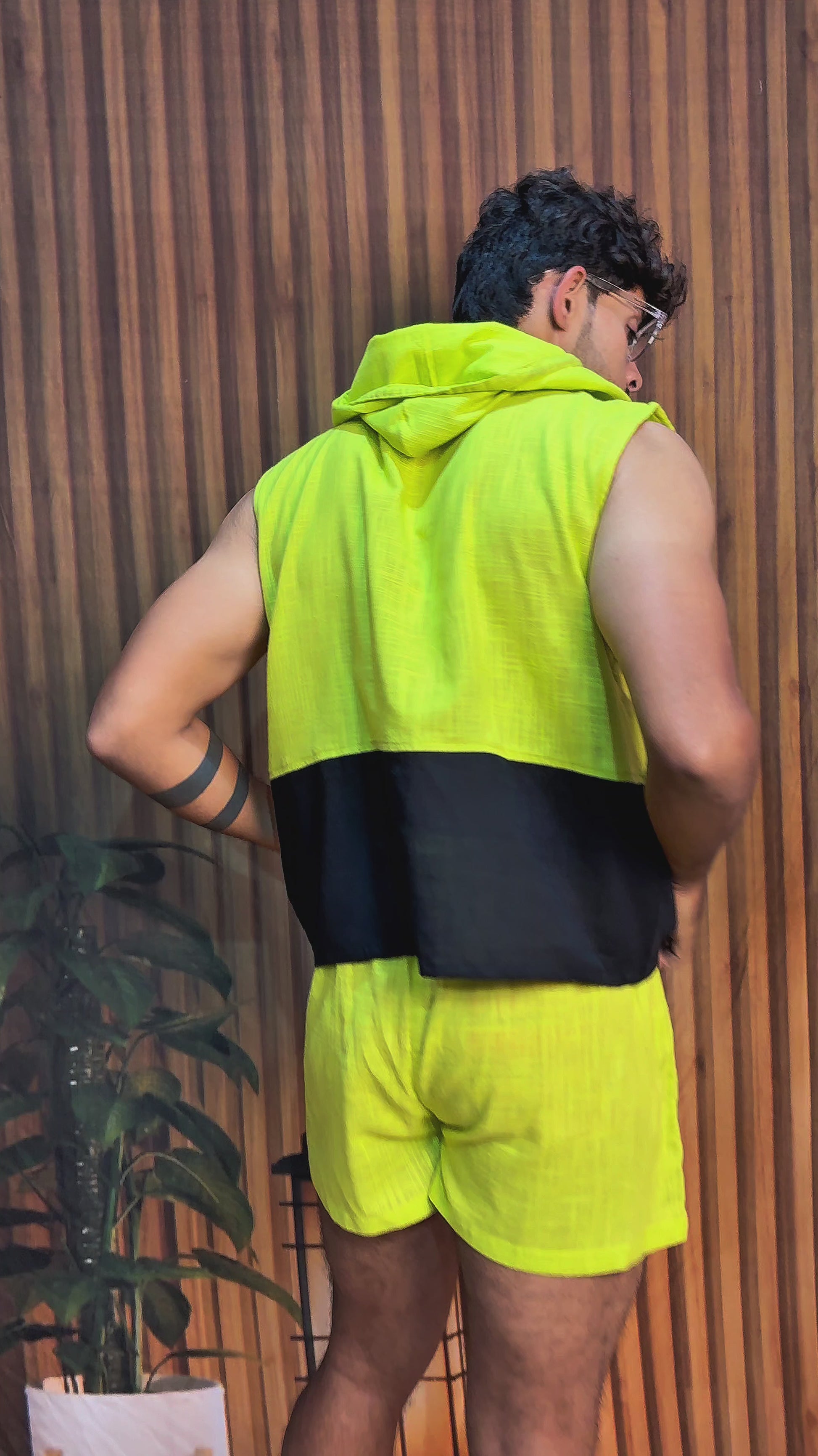 Men's 100% cotton beach wear sleeve less hooded top and short set