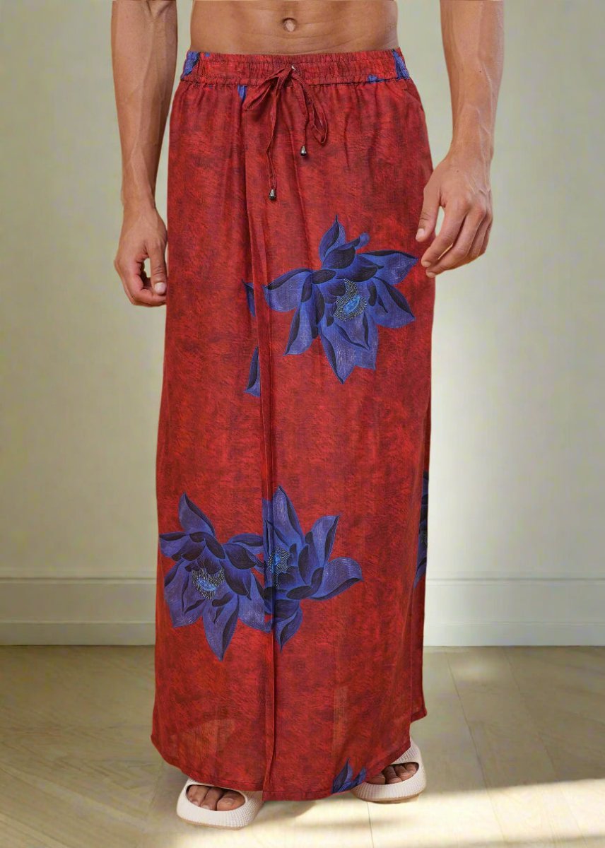 Introducing our Red Floral Motif Pajamalungi where timeless black meets statement art prints for a bold, cultural aesthetic. Model is 6 feet tall, wearing Size L.