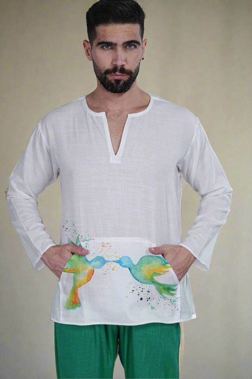 The kurta is white with long sleeves and features a split neckline , made in poly linen premium quality fabric . The standout feature is the colorful print of two birds facing each other near the bottom hem on kangaroo pocket, adding a unique and vibrant touch to the traditional attire.
