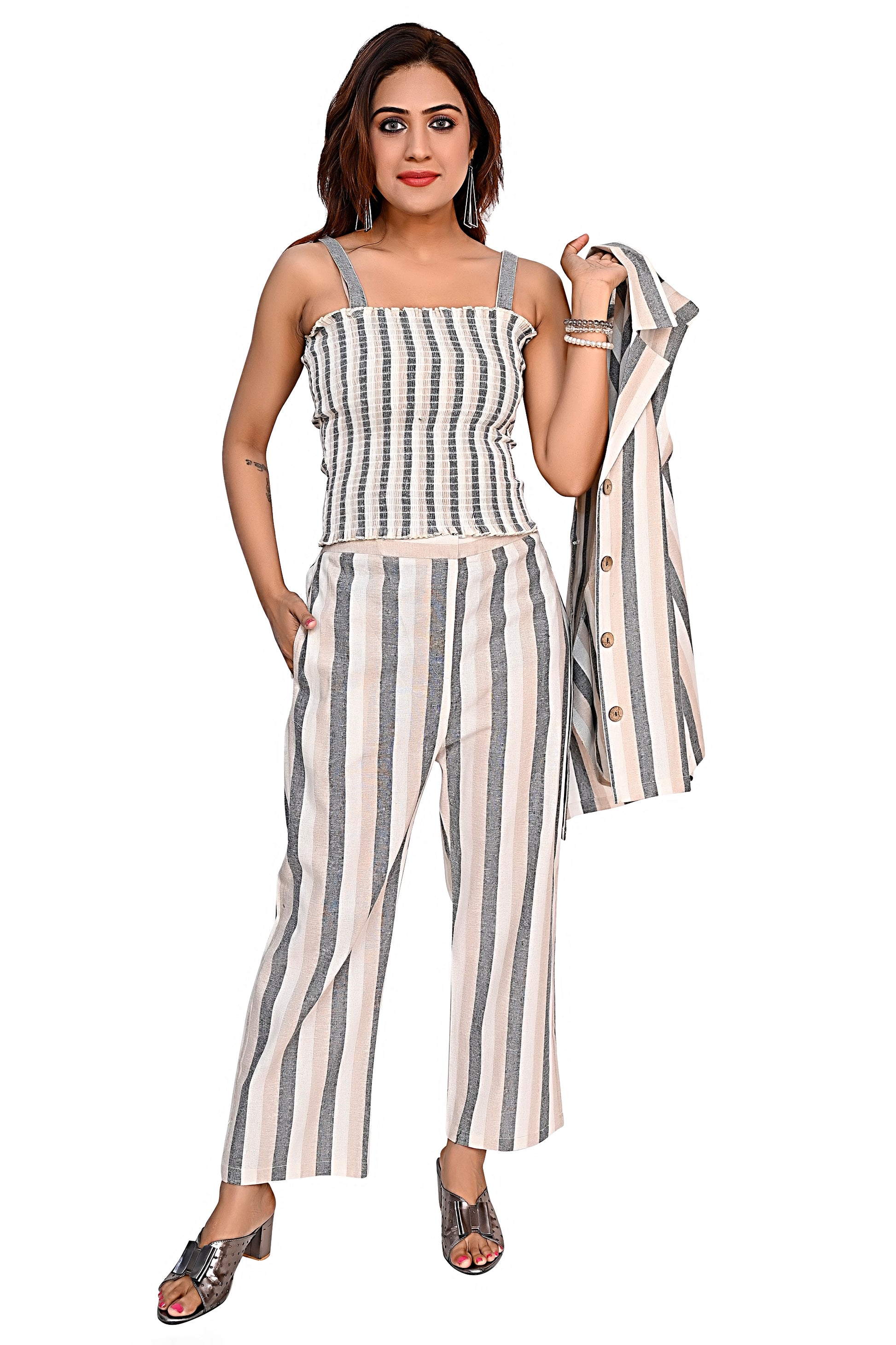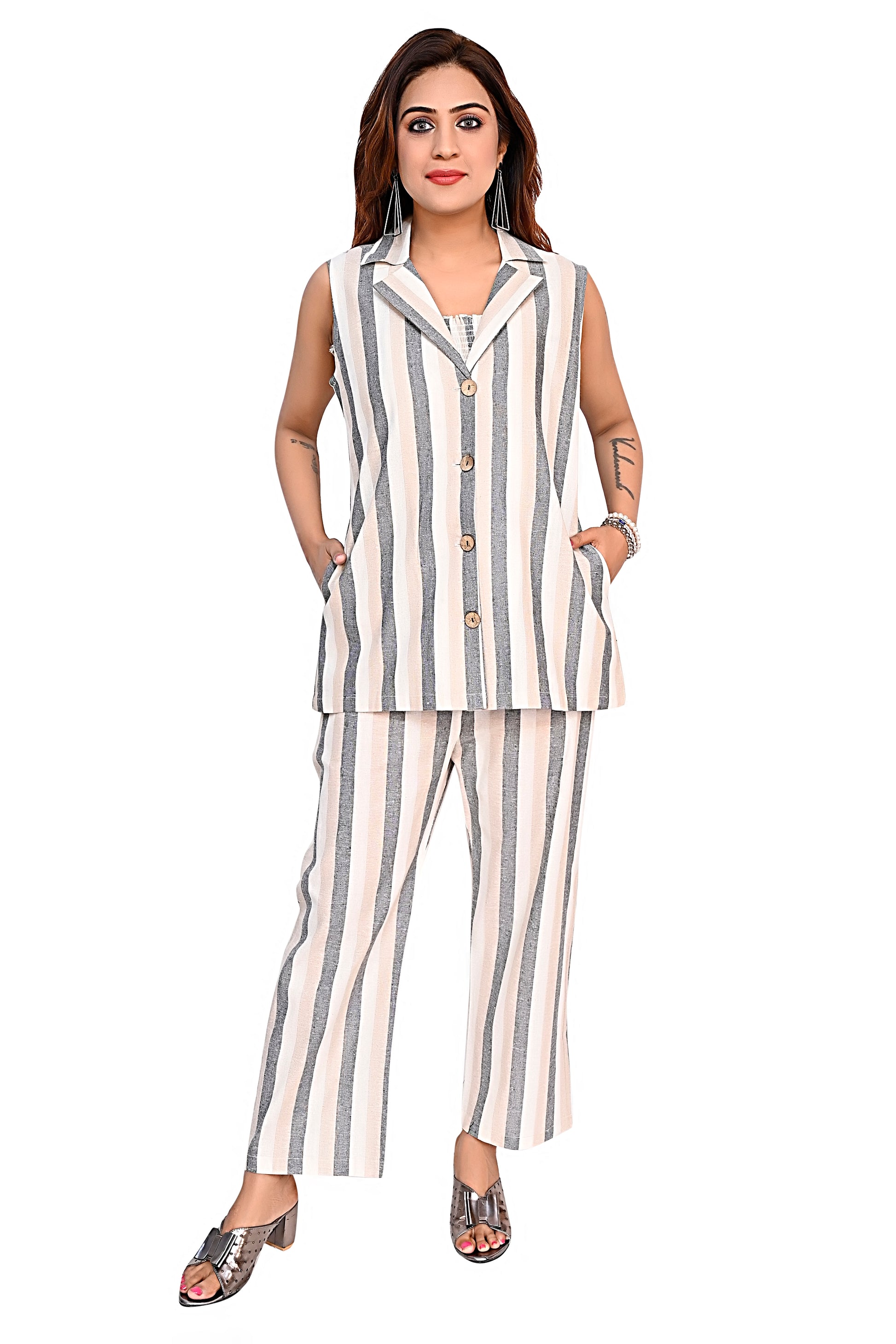 Beige aur grey stripes ka subtle combination is co-ord set ko elegant aur soothing look deta hai. Waistcoat style sleeveless top aur matching straight pants ke saath yeh outfit modern women ke liye perfect choice hai. Comfortable fit aur stylish design ise everyday fashion essential banata hai.